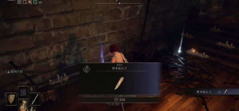 从王城西边城墙篝火位置开始出发,爬到旁边的屋檐上面看到有一个尸体可以获取黄金卢恩,走进城池里面靠左侧发光的位置就是神圣砥石刀。
