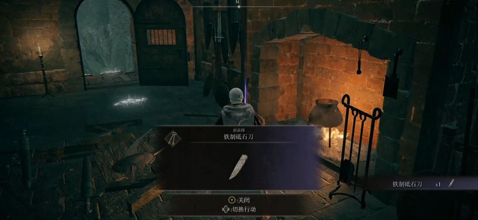 这个磨刀石能够让各位玩家在赋予武器属性的时候选择要追加的属性,来到城墙塔的位置,乘坐升降电梯下去,在路上可以获得一把石剑钥匙,铁质砥石小刀就在篝火的旁边。