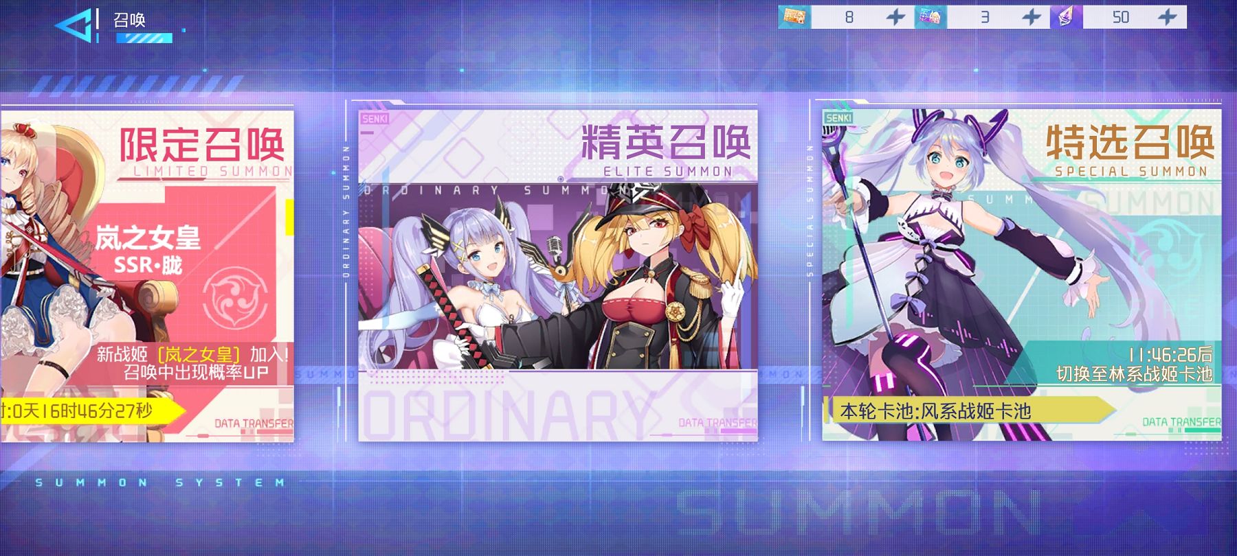 最后就是精英召唤了!这个卡池是玩家们获得战姬的常规和基础卡池,每过一段时间这个卡池就会有免费招募次数,使用的是单独的抽卡券。小伙伴们可以积极登陆参加活动来获取十连抽券!