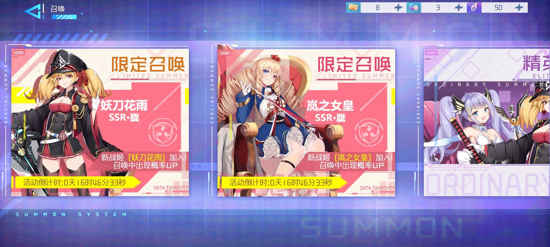 前两个限定召唤卡池拥有限定的角色,需要使用限定召唤券,适合高氪金或者对自己阵容有要求的小伙伴们,普通玩家可以肝活动积攒召唤券,在卡池快结束的时候进行抽取,这样会有更高的几率获得限定角色,但是不建议刚开局就抽限定卡池,可以积攒限定召唤券等待之后的限定卡池抽50次保底!