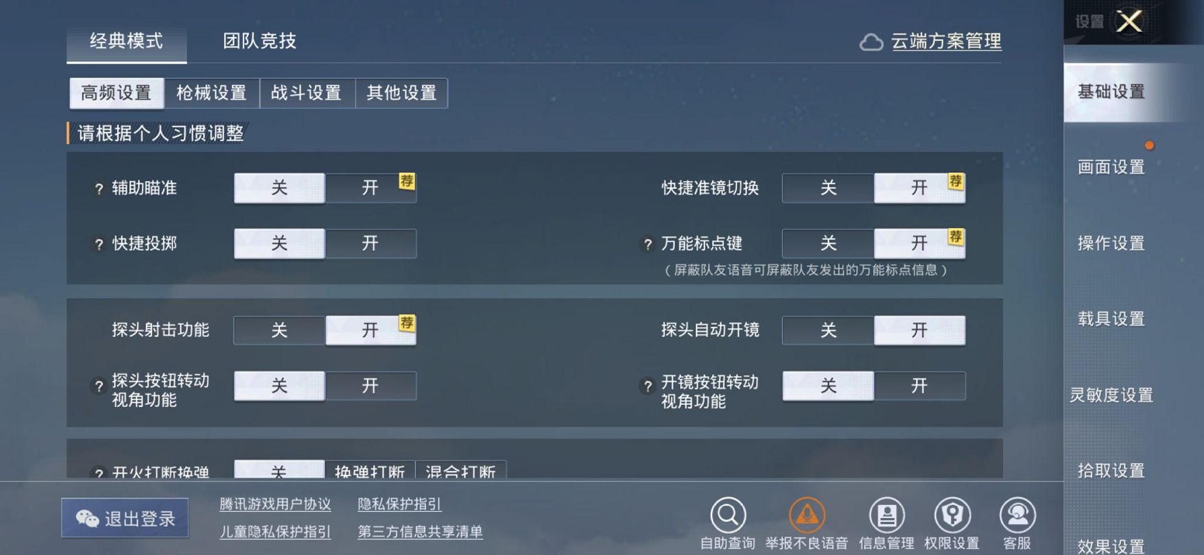 基础设置部分,在高频设置里,辅助瞄准选择关闭,开镜探头选择为长按,探头转动视角选择关闭。在枪械设置中,左手开火按钮选择总是开启,陀螺仪选择总是开启。