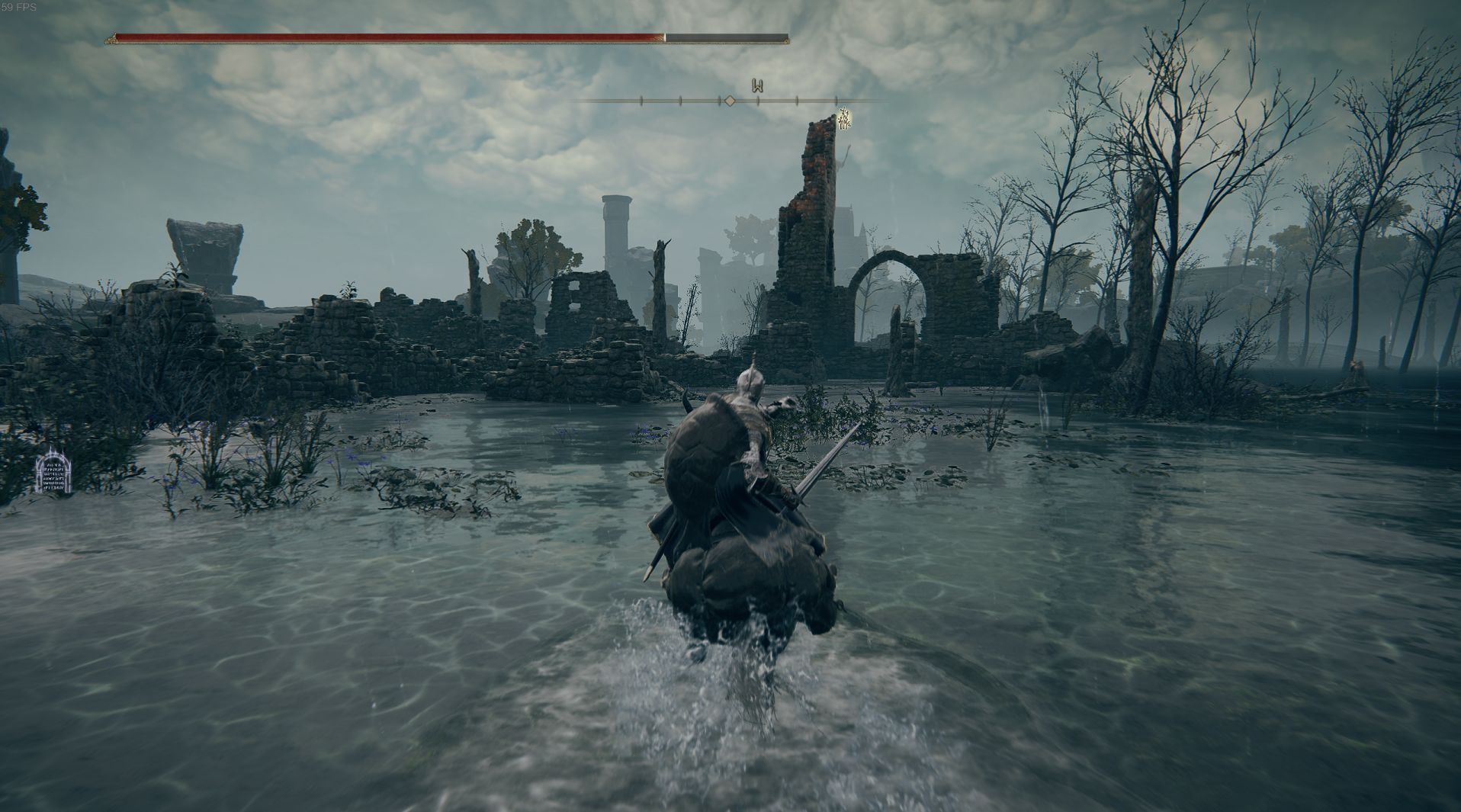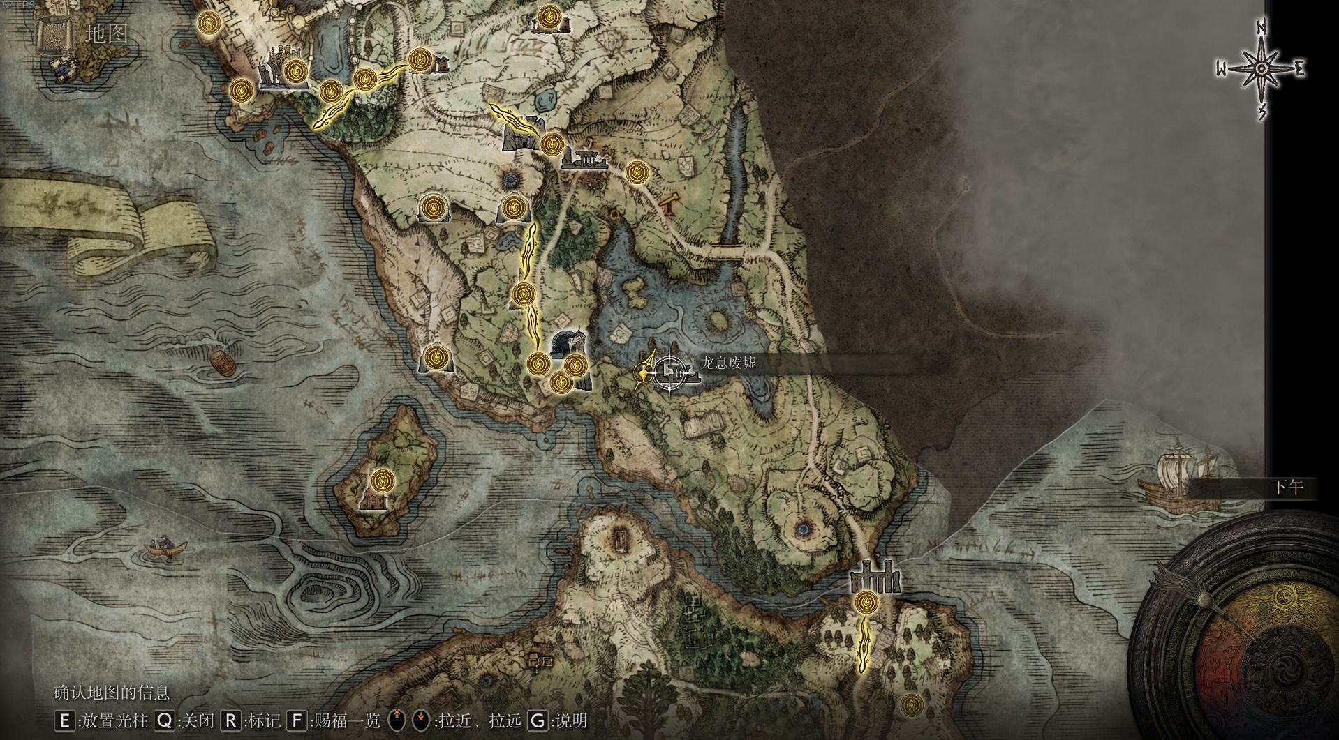 玩家们进入到游戏之后可以看到地图上有很多的赐福点,我们跟着赐福点的指引走就是直接过主线任务,但是要想找到龙息废墟的话就要先不去过主线任务。首先我们朝着风暴关卡主线任务指引的相反方向走,在前往啜泣半岛的路上可以看到有一片很大的湖泊,在这里就有龙息废墟。