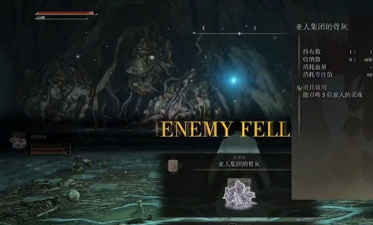 到达下层之后你会发现很多的不死尸,直接跑起来捡一些物品,这里有个尸体可以拿到三个根脂,来到楼梯口之后爬上去就会发现拉杆机关,可以打开锁住的门,这里通道要小心埋伏的小恶魔,解决掉之后从窗口跳下就可以挑战boss了,最后就能获取亚人集团的骨灰。