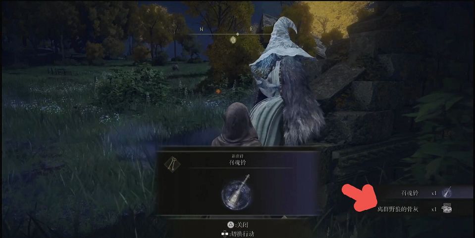 首先玩家们需要将骨灰装备到快捷栏,来到一个左侧有墓碑的地方就可以使用了,当然玩家们如果没有遇到女巫的话,需要来到大赐福的位置,向左前方走,就能看到售卖召魂铃的人,如果不打算花钱买的话也能够在艾雷教堂多等一个晚上。