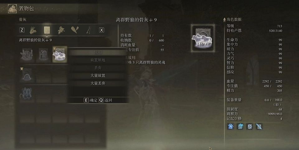 在召魂铃和骨灰的搭配使用下,这个骨灰可以帮助玩家们召唤三只离群野狼进行助战, 野狼的撕咬可以对怪物造成不小的削韧效果,而且能够快速的打断敌人的进攻,由于野狼本身的神位比较低,面对一些高身位而且使用横扫攻击比较频繁的怪物,可以有极好的效果。