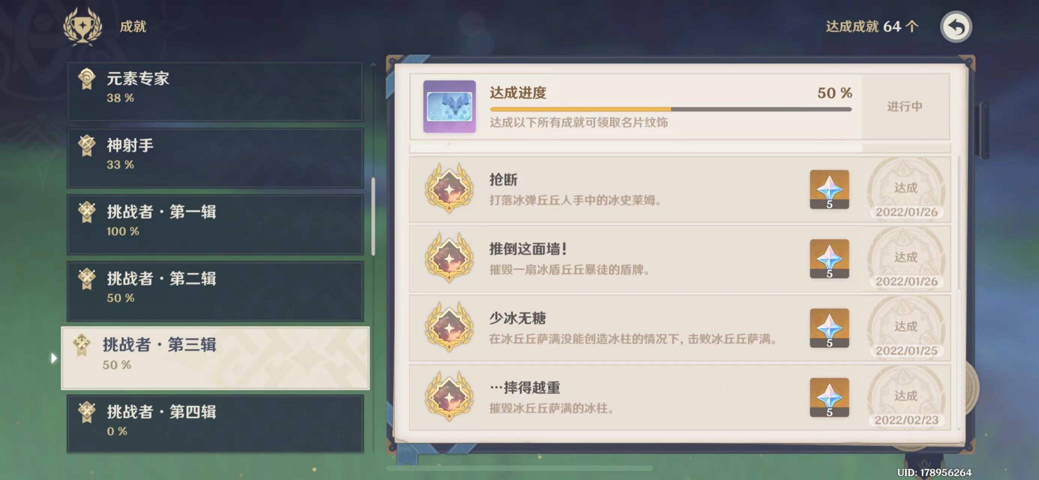 挑战者系列成就出了很多期,顾名思义就是通过自己的努力去战胜各种怪物,然后完成很难达到的成就,就可以一一解锁不同成就,然后不断地领取大量的原石。例如在不击破盾牌的情况下击败岩元素的史莱姆。