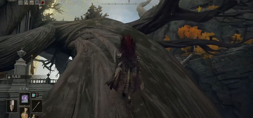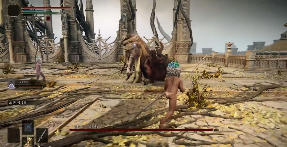 开局来到王城罗德尔走进地下宫,沿着走廊的位置顺便使用蹲伏按键,旁边儿的小怪不用管,跳上龙的翅膀,继续向前走之后遇到楼梯就爬上去,遇到一颗藤,左转是爬树根找到boss,右转就是去山寨大赐福收集道具。