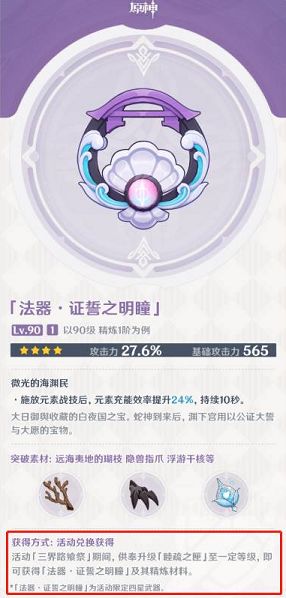 以上就是原神2.5法器证誓之明瞳在哪的具体攻略,在2.5版本当中,原神免费赠送的神器里,“证誓之明瞳”的属性算是比较不错的,最出众的还是高达565点的基础攻击力,但同样也要搭配适用的角色才可发挥出威力来,算得上是一个通用的神器,论强度和提升伤害的话意义不大。