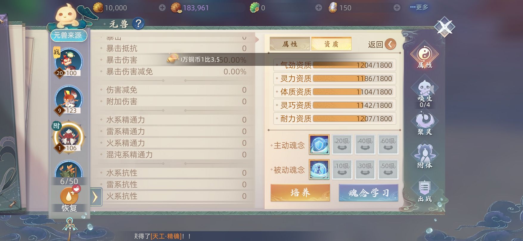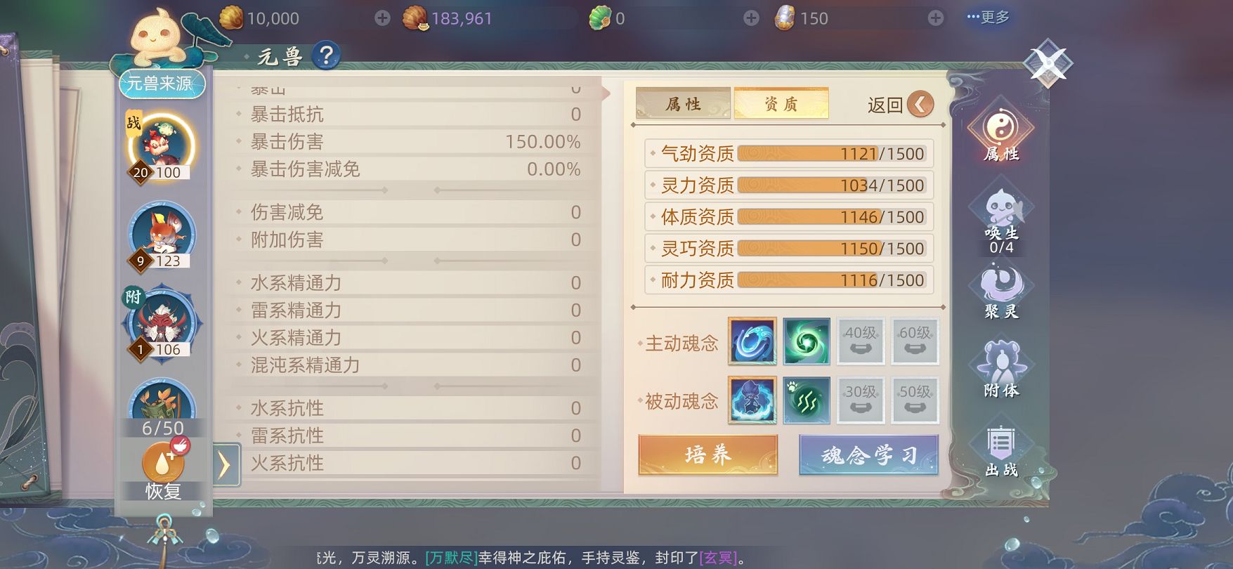 元兽有着气劲、灵力、体质等各项资质,它们分别代表了元素在这些方面的成长潜力,资质越高那么元兽提升时对应的属性也就加的越多。