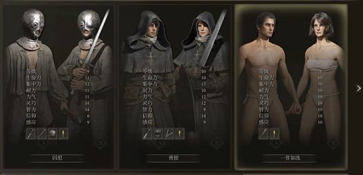 首先第一个就是人物的基础属性方面了,每个职业都有初始的等级和属性点。而无用之人是唯一一个初始只有等级1的角色,相对应的,一贫如洗的职业其属性点的总和也是最低,为80点,均摊到生命力、集中力、耐力、力气、灵巧、智力、信仰也是感应上都是10点,其他职业虽然都有较高的等级以及较高的属性点。