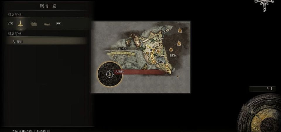 艾尔登法环游戏是有传送赐福功能的,如误入圆桌厅堂这个地点而且也打不动怪,接下来就点击大写的G键,然后打开地图,右键点开赐福一览或者是直接点击传送,按一下e键传送就行了,如果鼠标点击想要传送的地点没有反应的话,那么就可以使用wasd键移动传送点。