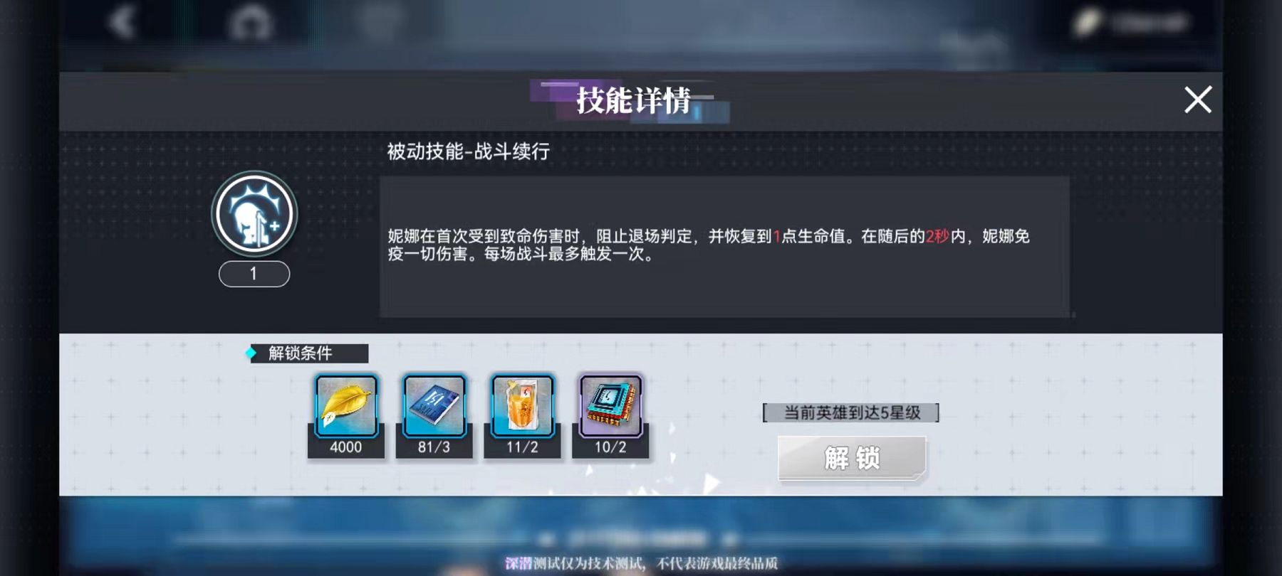 之所以推荐尼娜第一点就是妮娜拥有非常好的容错几率,自己的被动技能战斗续行可以在妮娜首次受到致命伤害时不会被退场,而是恢复到一点生命值。在触发之后的两秒内,妮娜免疫一切伤害。而且这个技能还可以进行升级,当升级之后这个技能的效果变为结束之后妮娜可以恢复自身15%的最大生命值,这个技能就相当于让妮娜多了一条命。