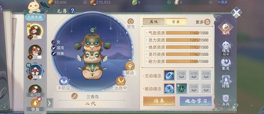 在妖神的选择方面一定要慎重,我们在妖神的属性菜单中可以看到资质。首先就是资质尽可能要高并且尽可能要平均。资质分为气劲、灵力、体质、灵巧以及耐力,这五个资质影响到就是妖神的成长属性。