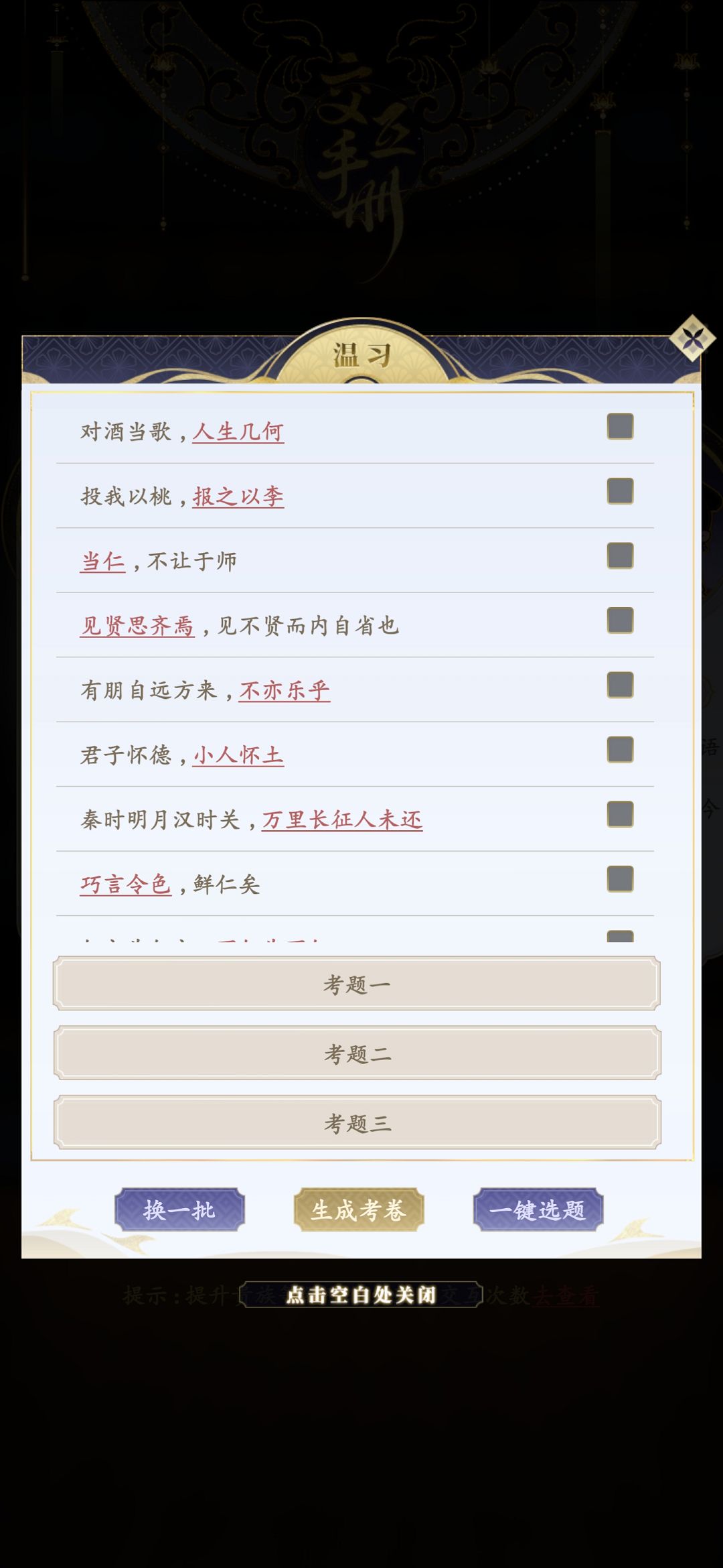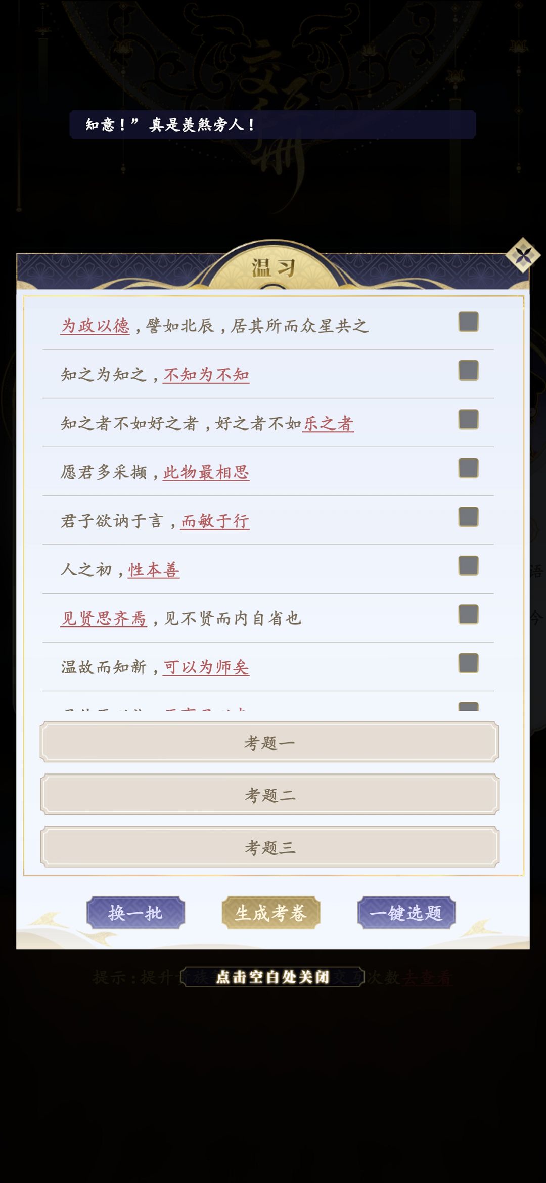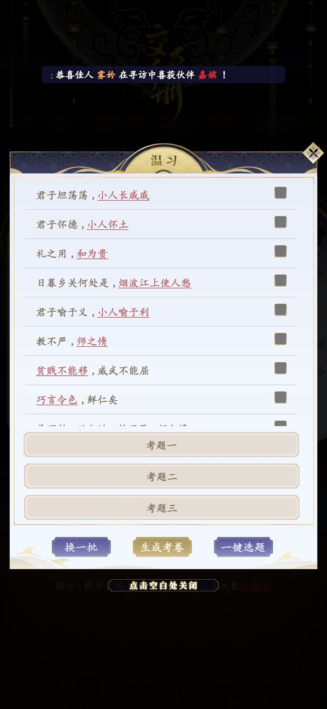 比如说第一次想要晋升到正九品的话考核题目可能就是:日暮相关何处是,需要玩家们回答出下一句,这在上面的温习题库中都是有的,在正式晋升到一个更高的官职之后,玩家们就可以解锁更多的诗词歌赋,不仅可以考核比自己官职低的玩家,而且他们答错之后,还会扣除声望值,影响晋升,这也是游戏的一大乐趣。