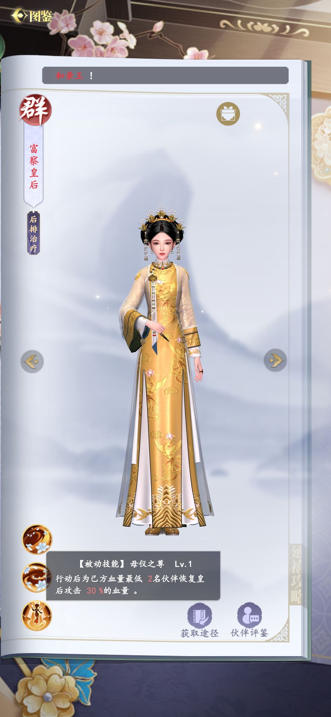 富察皇后是游戏内最强的一个奶妈,不仅是因为她每个回合结束之后可以为两名血量最低的队友回复血量,最强的还是她的每次普攻都有一定概率为全体回复血量,运气好的欧皇基本上就可以使用富察皇后和一个强势c位单挑顶尖战斗阵容。