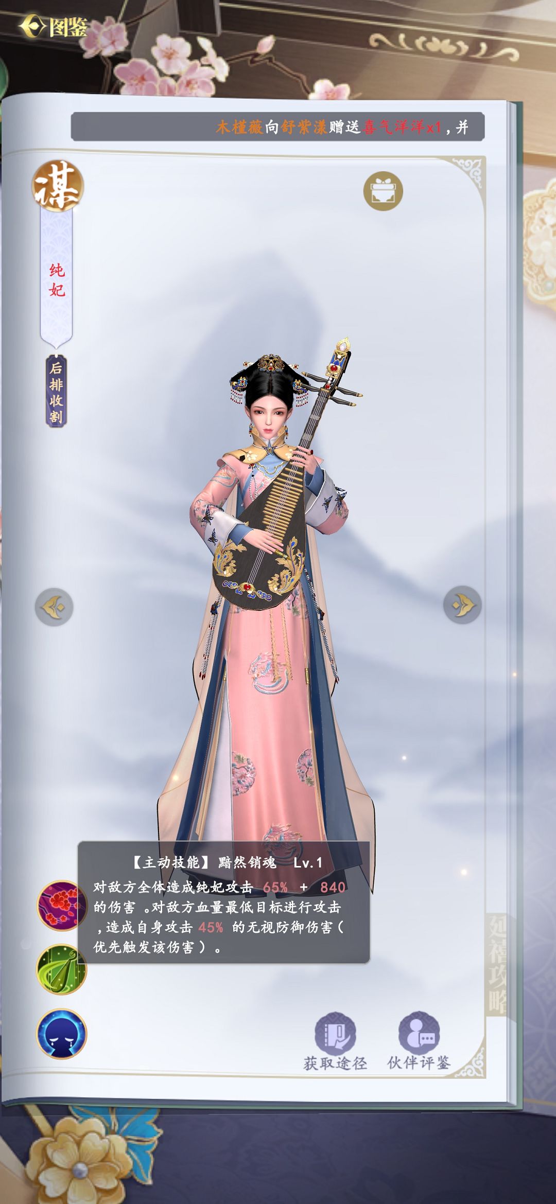 纯妃是游戏中来自于谋士阵营的后排收割角色,她的主动技能可以对敌方全体造成伤害的同时,对于敌方血量最低的角色还有额外伤害, 其实最大特点还在于她击杀敌人之后的回怒效果,可以使得她的主动技能释放频率极高。