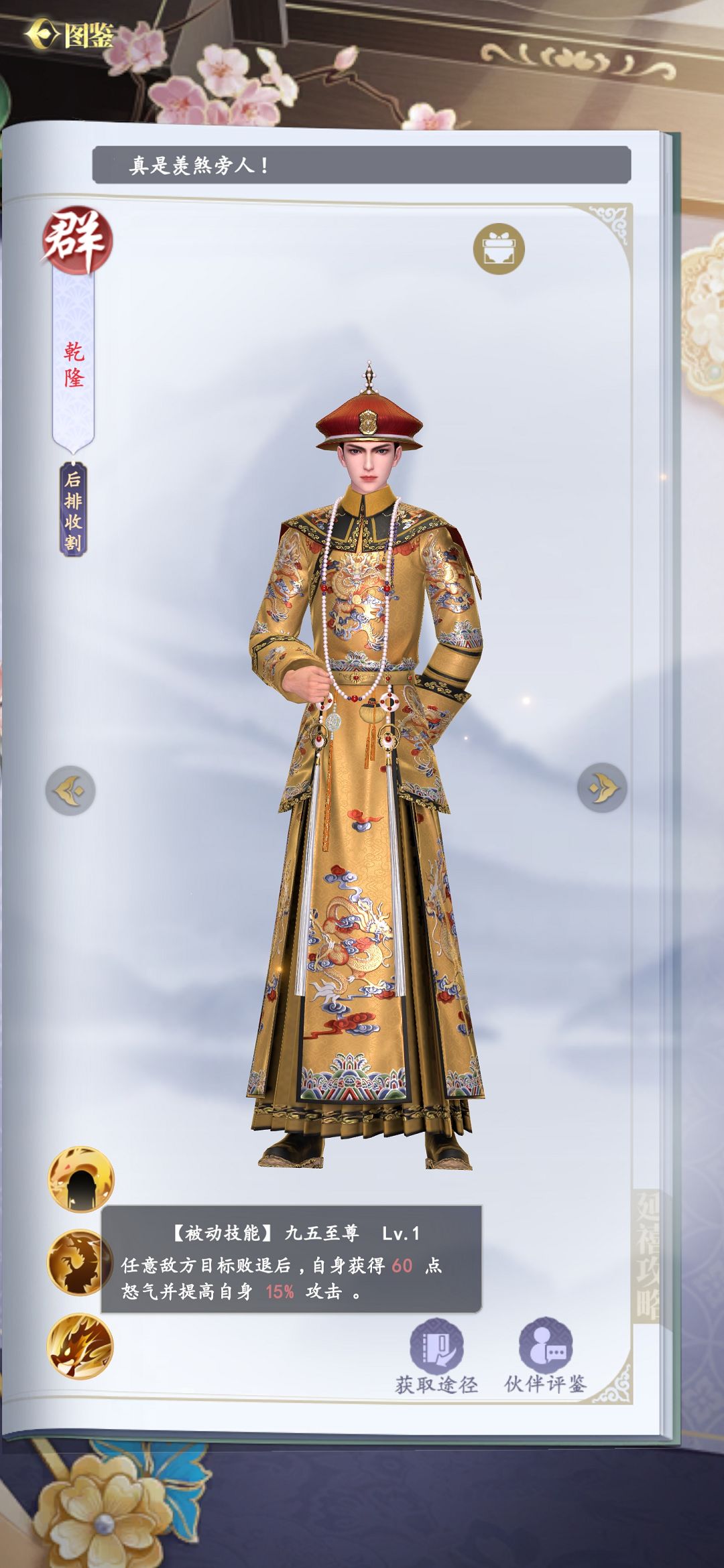 乾隆是游戏中的一个九五至尊的角色,他最强势的地方在于可以对敌方全体造成伤害的同时还会削减其增益状态,他也是唯一一个击杀对方之后能够回复怒气,还会增加攻击力的角色,乾隆在击杀了对方四名角色之后他的攻击力可以达到普通c位的四倍。