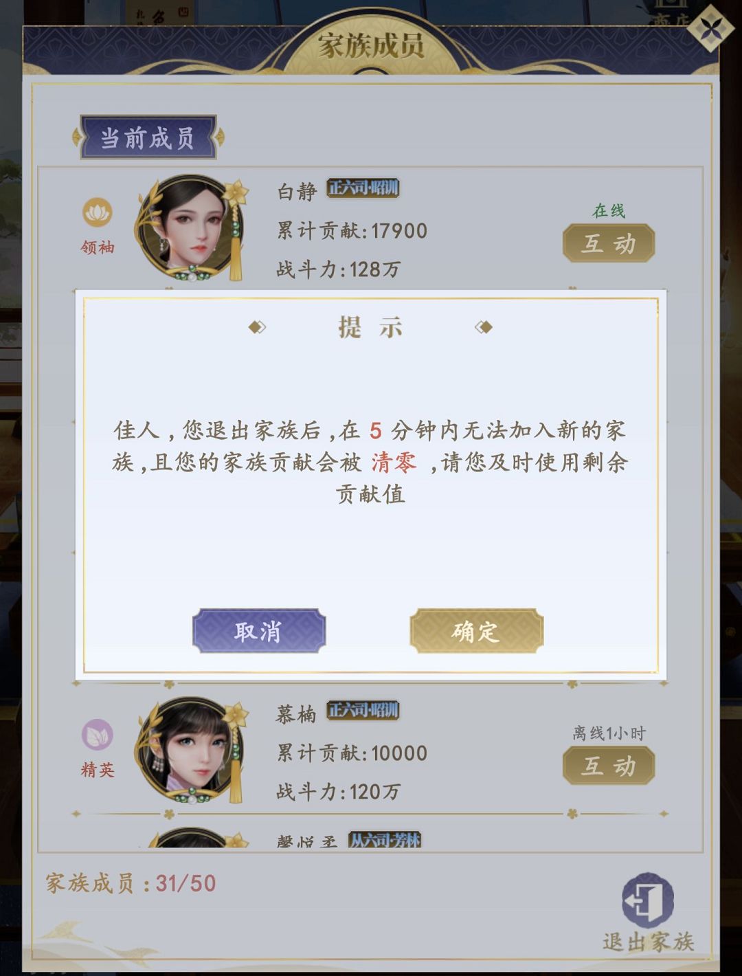 3、点退出家族,然后确定家族贡献将会被清零,所以在退出家族之前,一定要将剩余的贡献值兑换完成,否则加入新的家族之后,贡献值就会从零开始重新计算。
