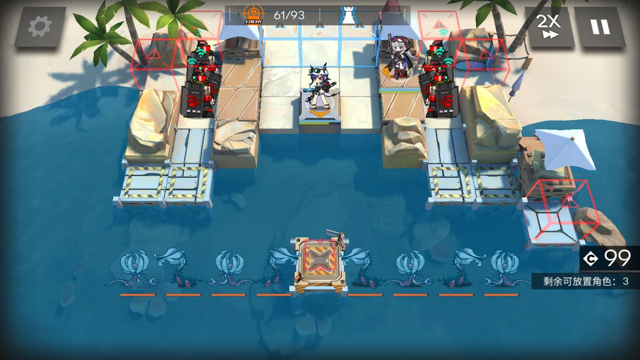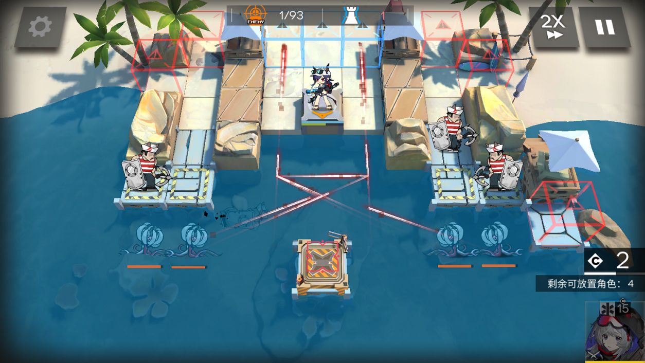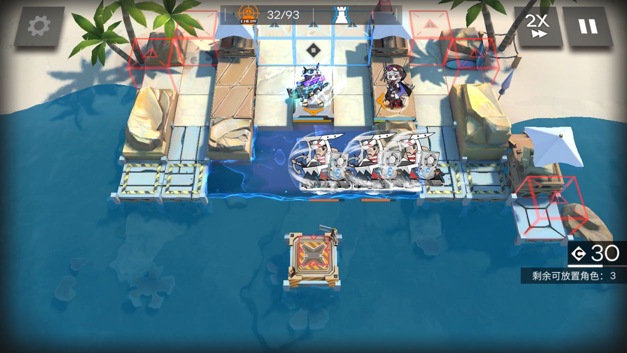 本关开局先在中间的地板上部署水陈,紧接着在后方部署桑葚为水陈以及地面干员提供治疗。前期虽然刷怪很多但是基本都不用管,由于有特殊地形的存在,水中的敌人会持续进行掉血,基本上等到上岸时就残血了,此时水陈的普攻就可以将其完美解决。在10杀左右后,左右下角会出现一群开着摩托艇的大力水手,此时就是我们开启技能的时机了。