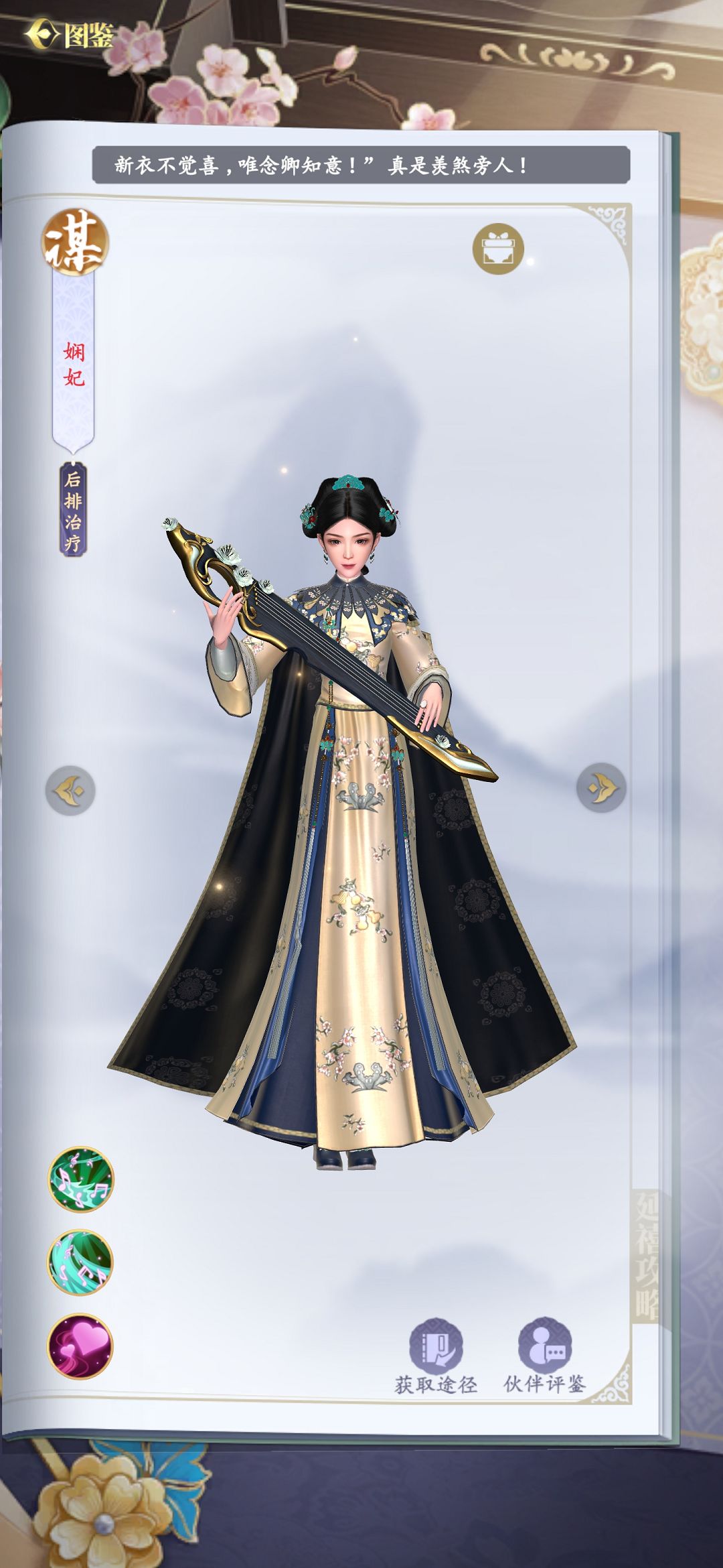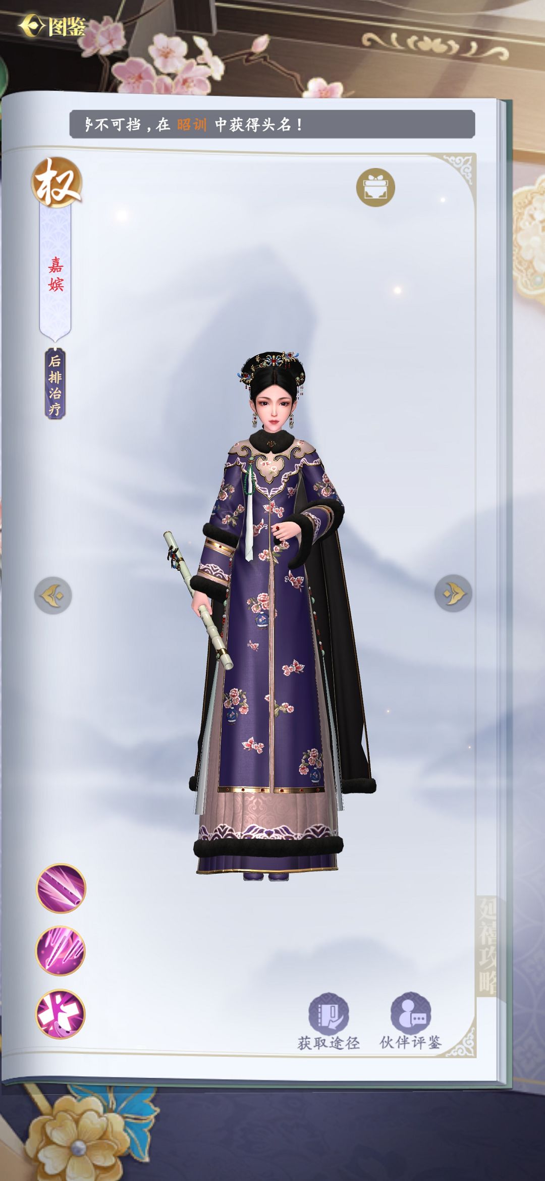 嘉嫔在游戏中是唯一一个可以为队友增加伤害、免伤效果的角色,而且每次在其行动完成之后还可以为队友回复已损生命值的血量。娴妃技能虽然也差不多,但是可以回复的目标更多,这样就能弥补嘉嫔回复目标太少的漏洞。
