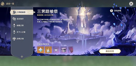 在满足条件之后我们需要前往海祇岛区域找到珊瑚宫心海并且接取三界路飨祭活动任务。在活动期间我们需要在变暗的渊下宫进行探索,并且找到隐藏在场景各地的睦疏之匣,将睦疏之匣供奉到一定的等级之后可以领取到法器武器证誓之明瞳以及武器的精炼材料和智识之冕。