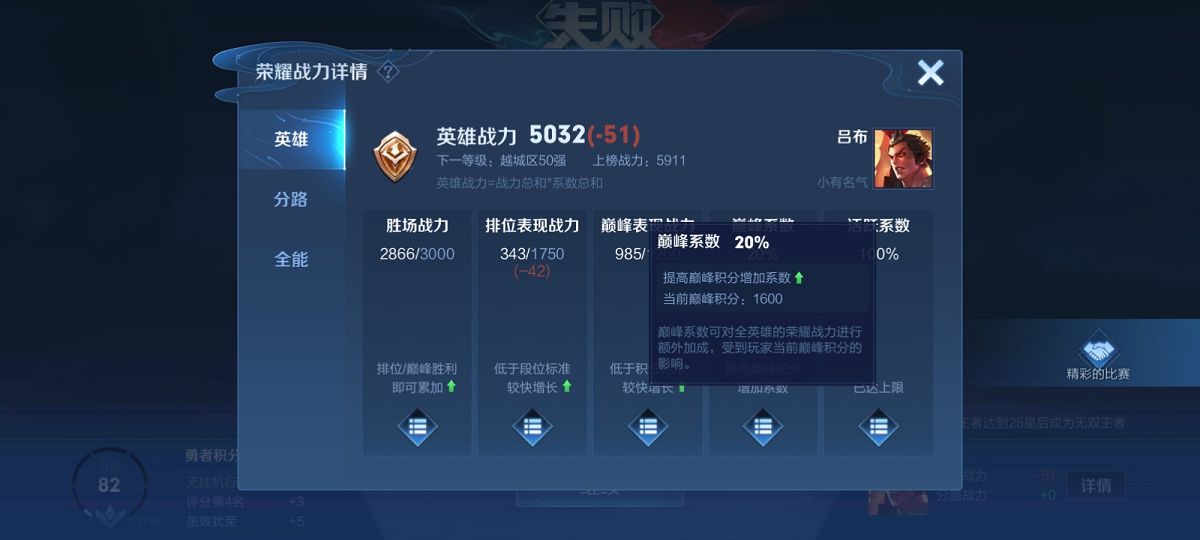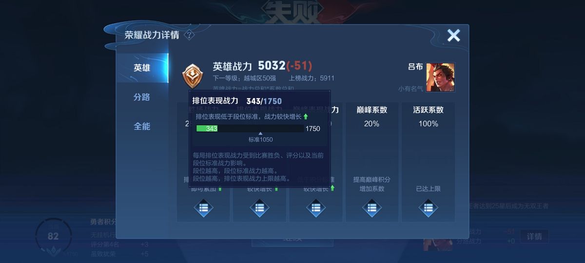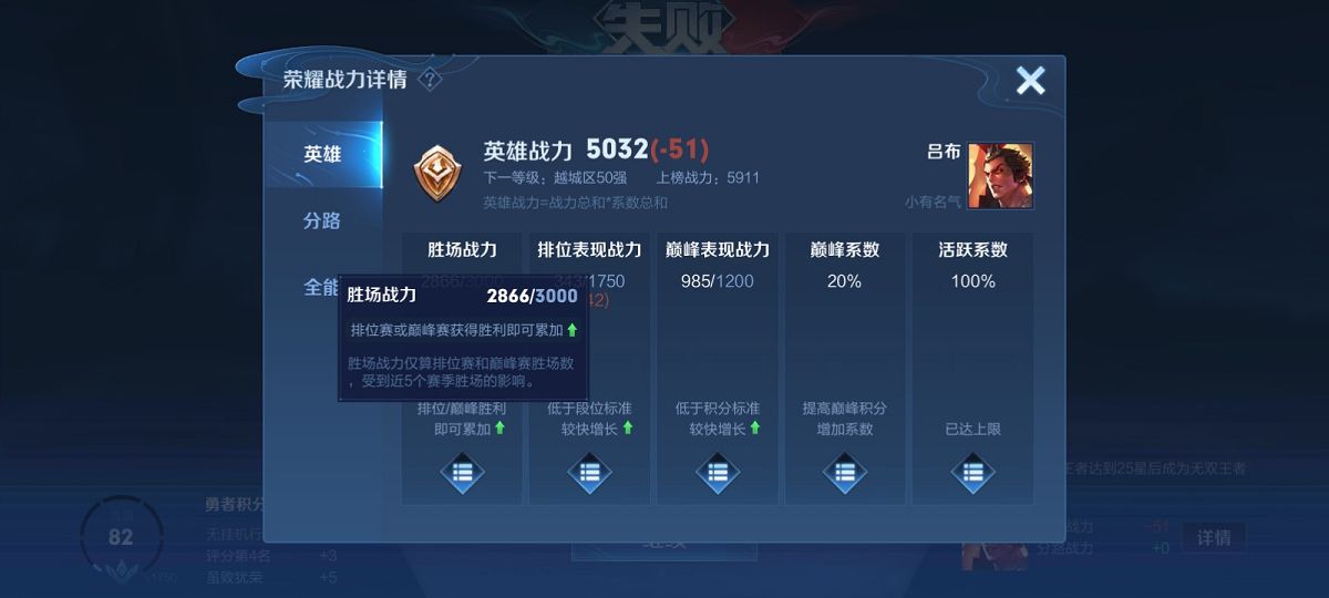 不少小伙伴在排位提升英雄战力时,总会发现有时往往获得胜利后并不能加多少战力,而失败却能抵上几把胜利加的分。这方面是因为玩家的排位表现分在对应段位即将打满,系统只能减缓增加速度,因此玩家想要快速增加排位表现分其中的一个方法则是将段位提升到下一个档次,才能有继续提升战力的可能。