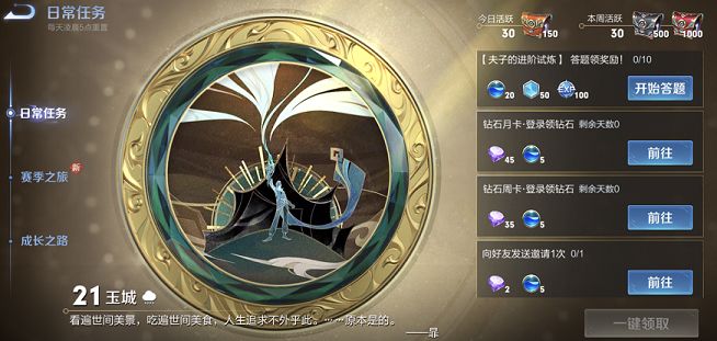之前版本在赛季结束后,都会根据段位直接发放钻石,但现在王者增添了很多活动,在日常任务当中满足150活跃度也能获得钻石,或者直接点击右下角的妲己头像,能将当日的所有奖励一键领取,完成签到和击杀等任务也都能获得钻石。