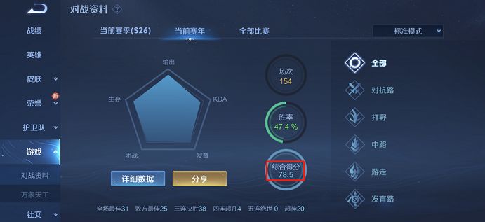 第二个查询隐藏分的方法就是看赛年数据,同样点开左上角的头像,在左侧的“游戏”中点开“对战资料”,就能看到当前赛年的场次、胜率、综合得分的数据,注意这里的“综合得分”其实就是隐藏分。如果当前的胜率高于50%,并且综合得分高于其他玩家,那么该账号下的隐藏分就特别高,就算出现连败的情况也特正常。