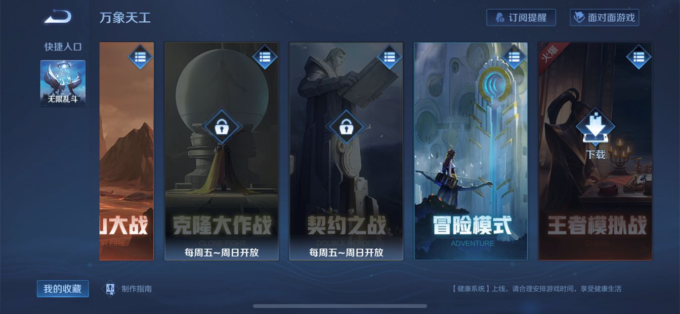 王者荣耀当中所有的娱乐模式,除了限定时间内开启的玩法,基本都规到了“万象天工”当中,打开后第六个选项即可看到“冒险模式”。现在冒险模式一共分为两个玩法,一共是“武道大会”一个是“六国远征”,玩家可以在这两个新的模式中获得所有奖励,其中包括了钻石和道具兑换币。