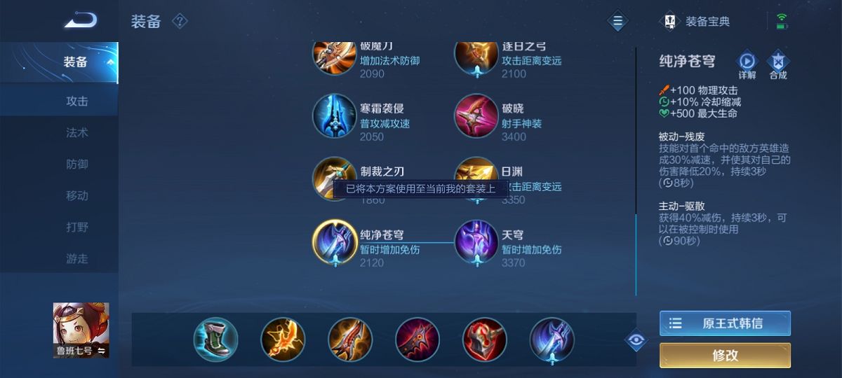 末世对扫射输出的鲁班是最合适的一件装备,扫射中附带目标生命值的伤害,再加上扫射暴击伤害,两个扫射就能轻松压低对面坦克血量,因此如果是顺风形式,可以选择先出末世,当然己方如果是劣势应当先做对应的防御装备。最后一件装备可根据对面阵容,如果敌方阵容后排切c能力差,可以补一件纯净苍穹,帮助规避致命控制伤害,最后就是复活甲名刀切换,本赛季鲁班在后期还可选择血手,血手新增的普攻造成额外生命值伤害非常适合s26赛季的鲁班。