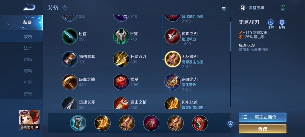 鲁班七号前期主要出抵抗之靴,电刀和无尽。这三件装备也要根据顺序出,首先先合成狂暴双刃,在单独对线其他射手的时候,可以轻松获得线权,压低敌方血量,之后直接合成抵抗之靴,可以克服前期小团战控制的局面,之后直接合成电刀,将攻速提升后,就合成无尽提升攻击力,这样鲁班从前期过度到中期就有团战输出的能力,中期装备可以选择合成碎星锤,或者末世。选择碎星锤而不是破晓,鲁班的主要伤害来源是扫射,破晓主要增加攻速,攻击伤害增加不高,而且碎星锤破甲和破晓相近,碎星锤的价格更低,性价比更高。