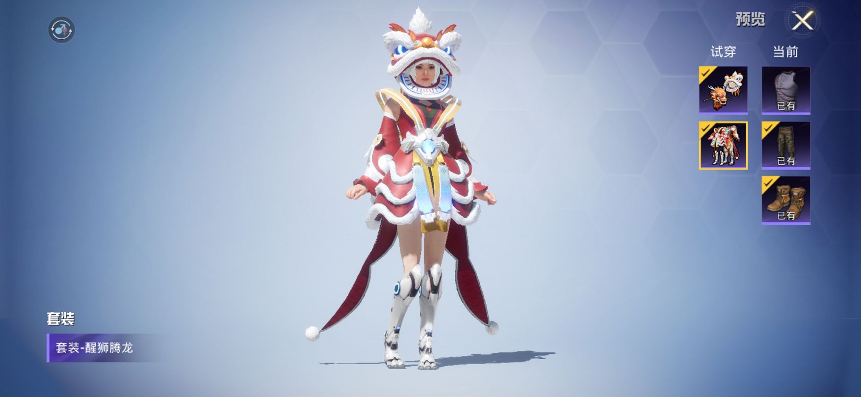 这套时装是虎年限定,采用了一体衣的射击,红白两色非常的喜庆好看,在游戏中也是非常炫酷的时装之一。目前这套时装是可以在兑换商店中使用60个龙狮福利碎片兑换的,无需购买,还是非常值得入手的。龙狮福利碎片完成特定活动即可领取,每日可以领取的数量还不少,大概一周左右即可拿到这套时装。