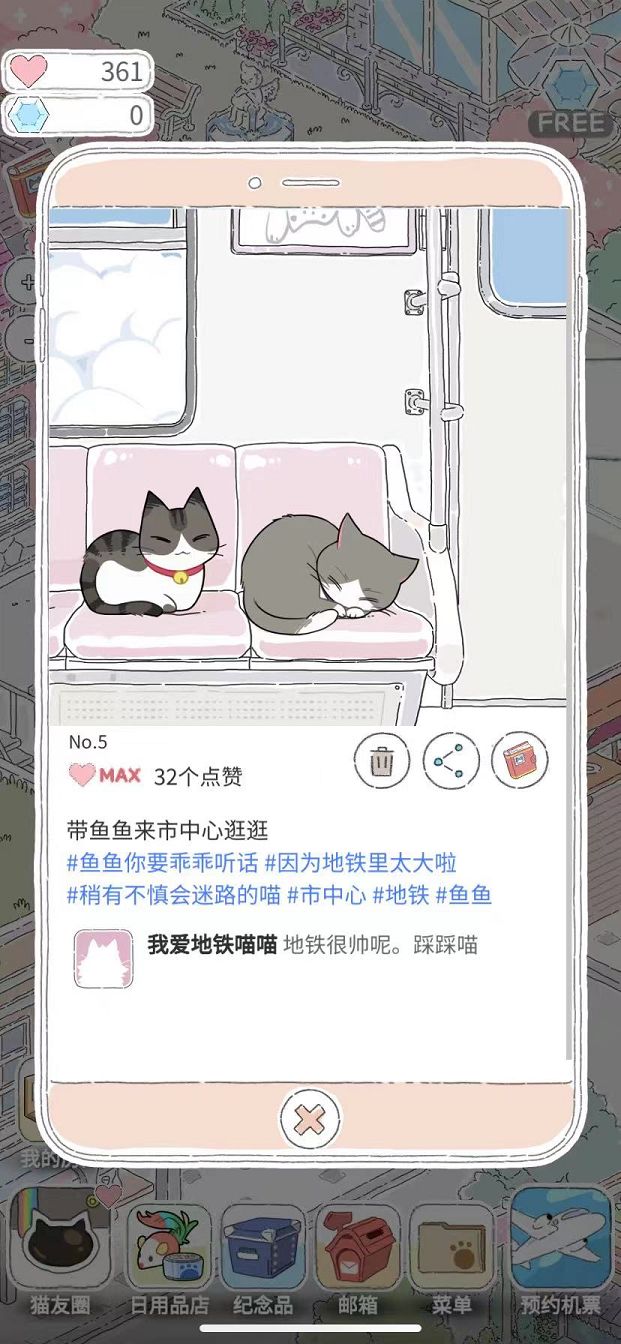 相关阅读 猫友圈猫咪的旅行自拍杆获取方法-猫友圈猫咪的旅行自拍杆怎么获取 猫友圈猫咪的旅行纪念品作用详细介绍-猫友圈猫咪的旅行中要不要带纪念品旅游 猫友圈猫咪的旅行购买墙纸的方法-猫友圈猫咪的旅行中墙纸在哪里 猫友圈猫咪的旅行点赞数使用攻略-猫友圈猫咪的旅行里点赞数有什么用 猫友圈猫咪的旅行获取特价机票方法一览-猫友圈猫咪的旅行怎么获取特价机票 猫友圈猫咪的旅行解锁图鉴方法一览-猫友圈猫咪的旅行如何快速解锁图鉴