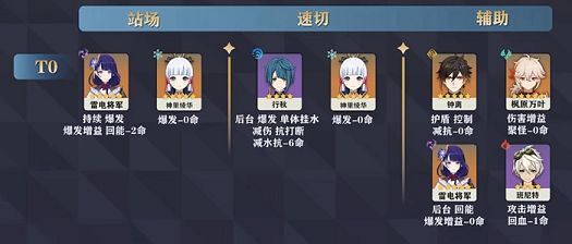 首先是站场角色,目前版本最强的两个角色是雷电将军以及神里绫华了。雷电将军讲究的是持续的爆发伤害,而在培养到二命之后可以触发回能效果以及爆发的增益效果。神里绫华则主要就是打爆发,0命就可以出战了。速切型角色推荐行秋,行秋主要是可以在后台给敌人挂上水元素效果,而且还拥有较强的抗打断能力并且能够进行减伤。使用行秋建议培养到6命,能够减少敌方的水元素抗性。