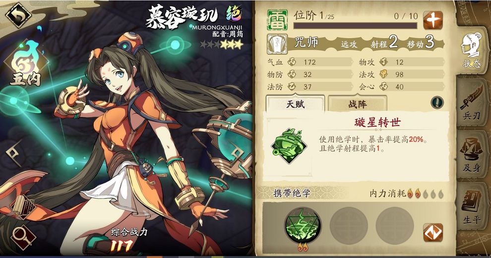 4、慕容璇玑:慕容璇玑是一个远程攻击角色,自身有着不错的暴击与AOE输出能力,实用性比较高。