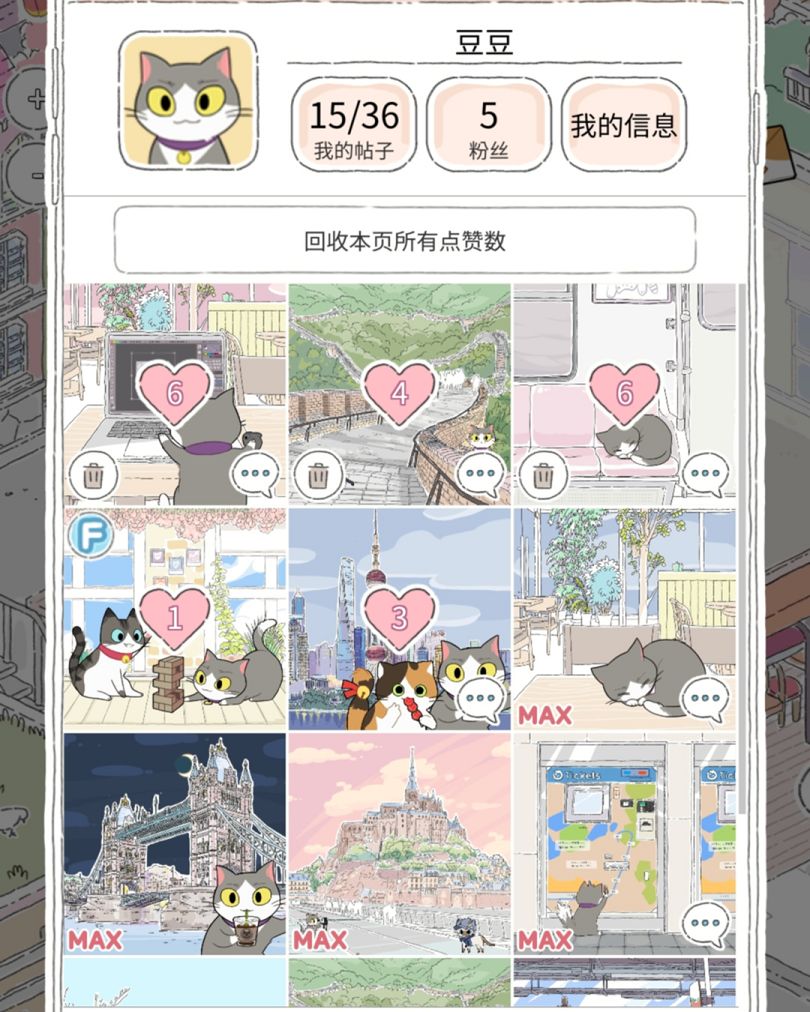 好啦,以上内容介绍就是猫友圈猫咪的旅行怎么增加帖子数量的详细介绍,简单来看,我们可以使用点赞量来扩充猫友圈空间,增加发帖的数量。也可以删除不能再收集点赞量的帖子,完成猫友圈空间再分配。