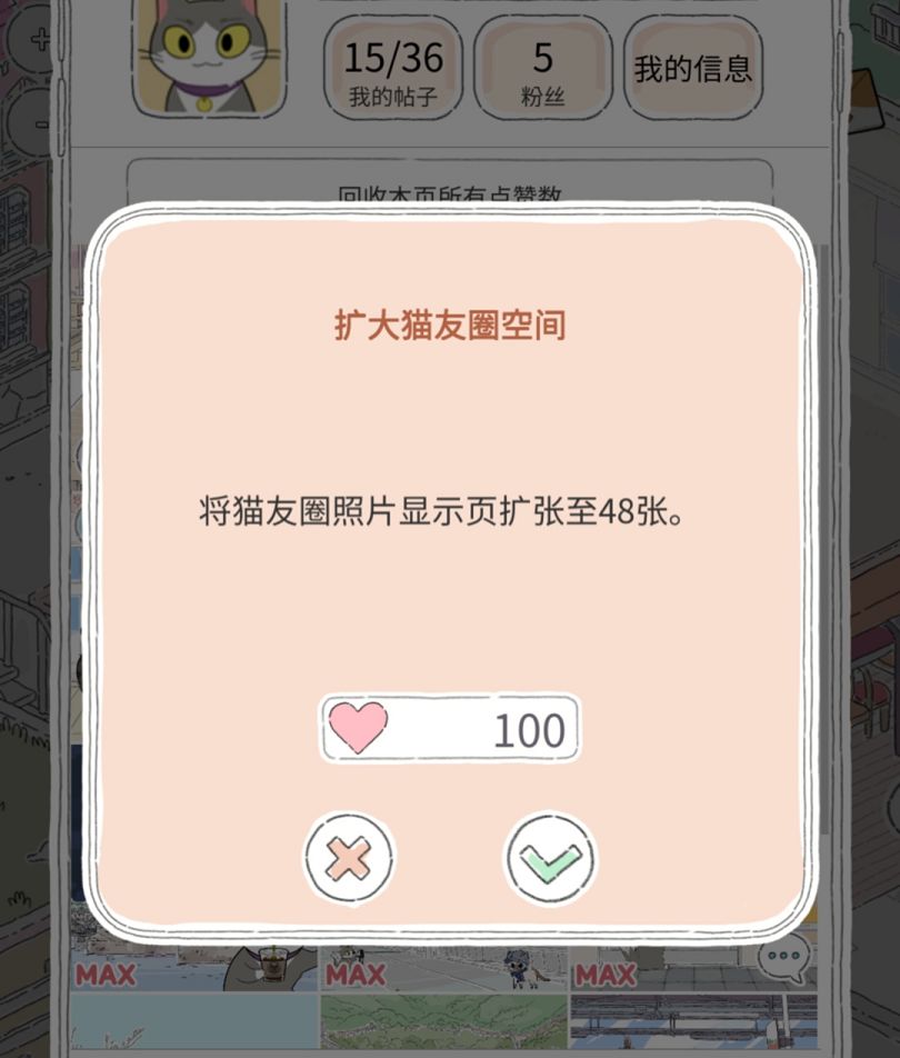在游戏初期有24个猫友圈帖子数量,但这完全不够晒猫使用的,很快就发不了新的帖子。这时我们可以提高猫友圈的帖子数量上限,具体方法如下: