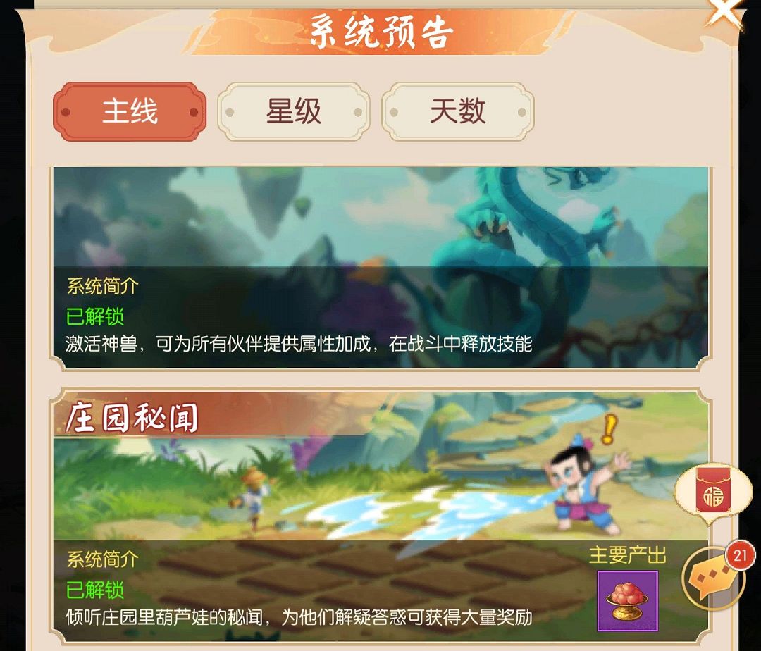 玩家们需要通关新葫芦兄弟的4-10主线关卡之后,才能解锁庄园秘闻录玩法,对于不氪金的玩家来说还是有些难度的,最好优先观察一下佛系,妖系和魔系三个种族之间的阵容克制关系,而且队伍中最少有两个橙卡才能打败第十关的魔物。