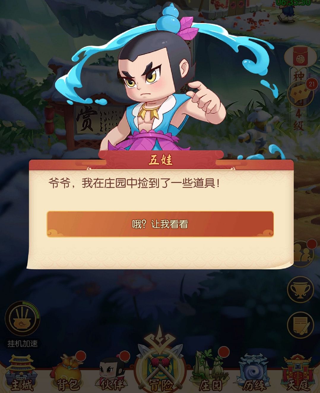 大家来到庄园主页面之后,可以看到七个葫芦娃分别有不同的任务,水娃帮助爷爷浇地,火娃帮助爷爷烧锅,剩下的人一个在天上一个在地下巡逻,而大家会时不时的发现他们的头像右侧有一个感叹号,这种情况下就可以点击,主要是为了倾听庄园里葫芦娃的各种秘闻,帮他们答疑之后可以获得很丰盛的进阶奖励。