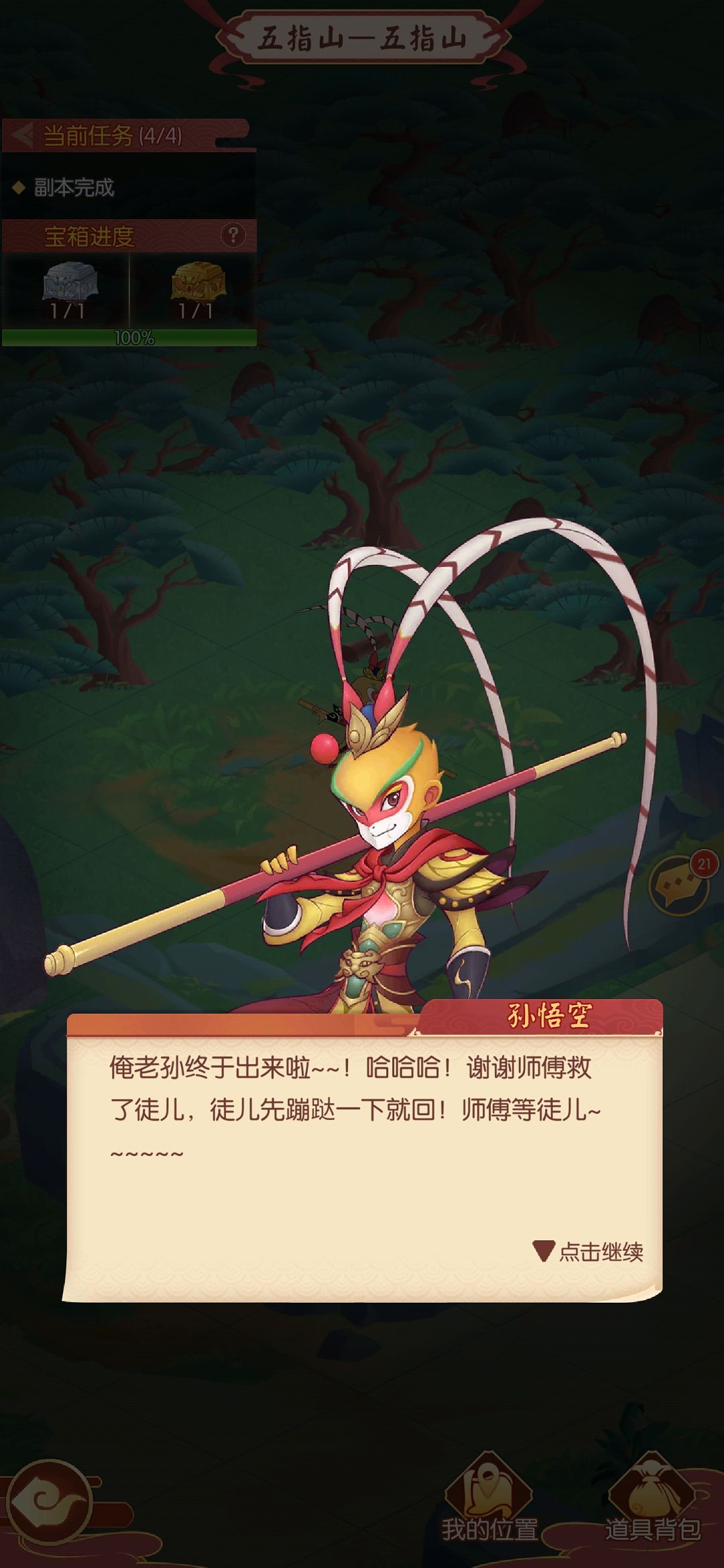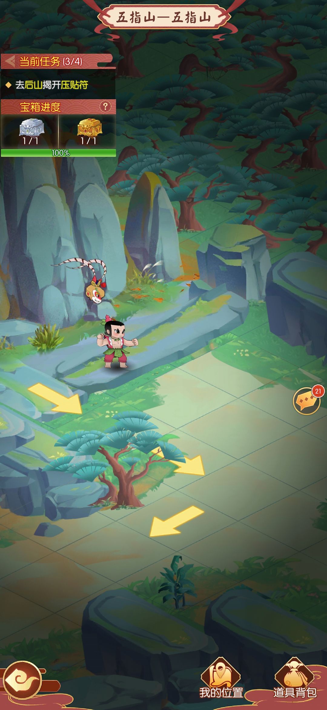五指山这个关卡中,进入之后需要大家沿着地下的黄线一直走,遇到一颗松柏树转弯,这个时候就能遇到被压在五指山下的孙悟空,我们需要去到后山帮他揭开压贴符,孙悟空获救之后就会回到花果山收拾行行囊和师傅一起上路,我们只需要退出然后提升战力和孙悟空一起挑战花果山副本就行了。