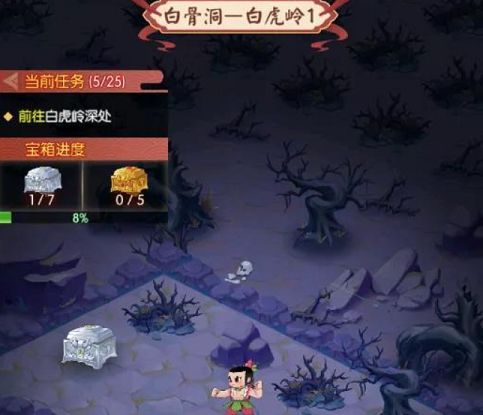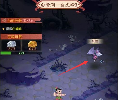 在深探白虎岭的路途中我们会发现一个金宝箱和一个银宝箱,在遇到妖兽(类似于拿着粪叉的蝙蝠),尽量不要与其离得太近,否则会被迫开启战斗,这个怪物如果不氪金的话,以玩家们目前刚通关,第15章节的战力是完全挑战不过去的,所以千万不要乱刷。