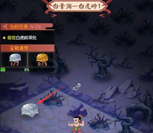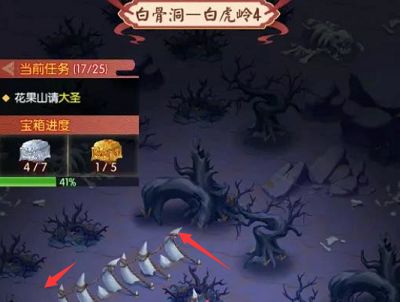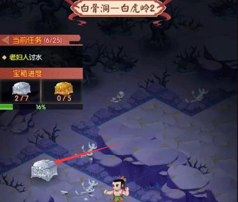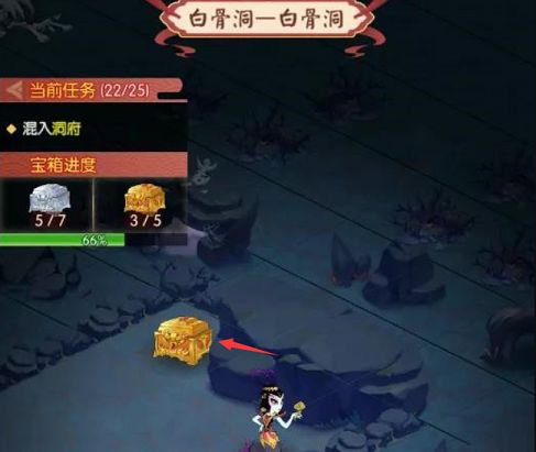 4、重新完成混入白骨洞洞府任务之后,大家只要沿着指引的路线看到白骨精就能看到第四个金色宝箱了。