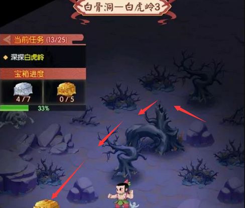 1、来到白骨精副本中旬沿着图示路线即可找到第一个金宝箱。