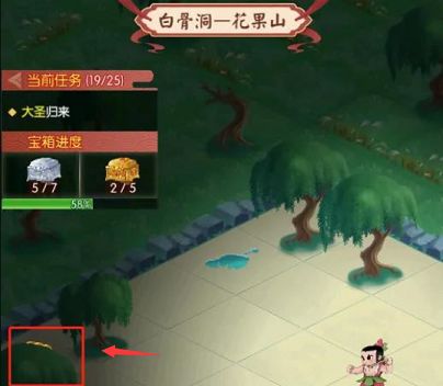 3、第三个金宝箱藏得比较深,来到花果山的广场之后大家需要仔细观察柳树下面的隐藏位置。
