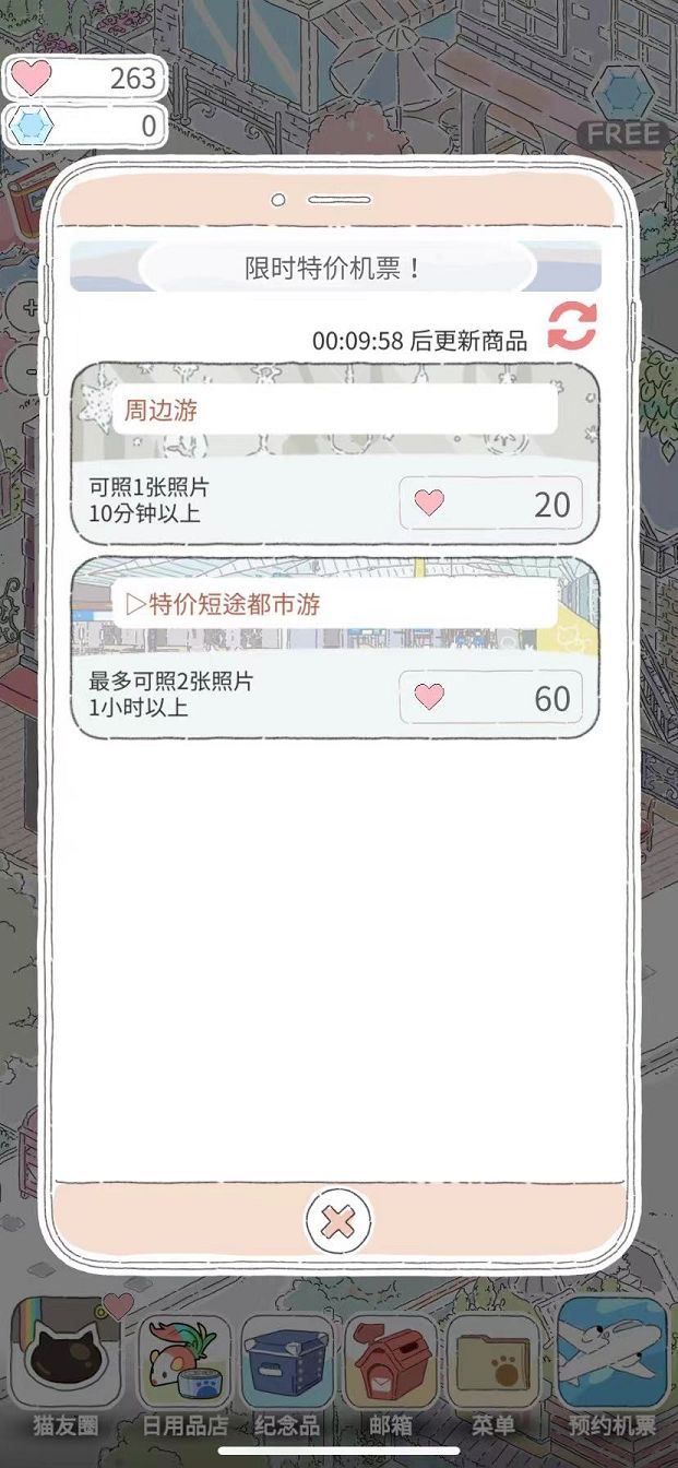 想要出去旅行,就需要购买机票。机票分为两种,一种是限量机票,第二种就是特价机票,限量机票每次可以拍摄一张照片,每天可以触发五次,一次需要10个点赞数,而特价机票每天可以触发两次,每次拍摄两张照片,一次需要60个点赞数,在游戏前期,这两个机票玩家们最好是都用了,可以为自己后期的发展提供更多的货币保障。