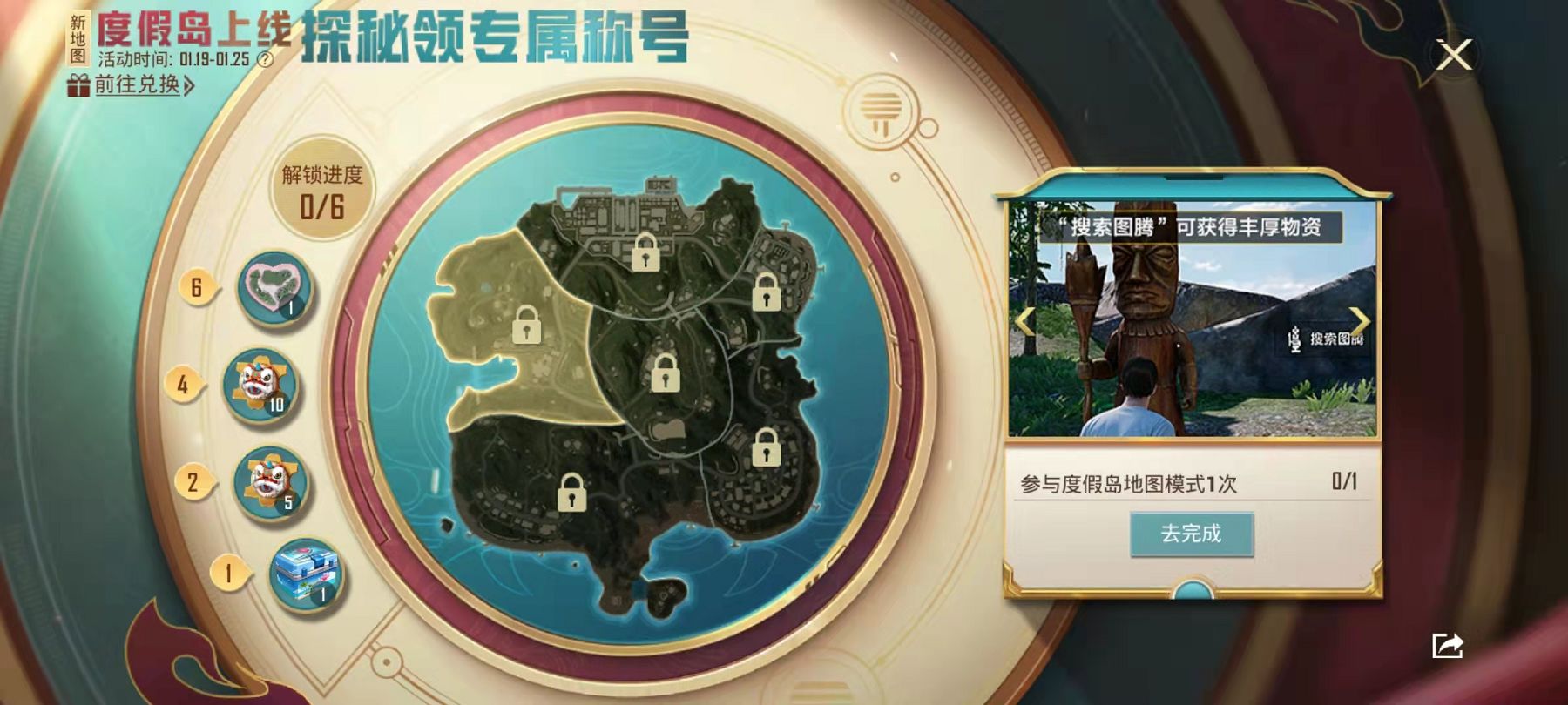 探秘送称号是建立在和平精英春节活动期间推出的度假岛全新地图之上,这里玩家可以通过完后活动任务,来解锁6处小岛地图。随着玩家的解锁进度,还有称号、宝箱、龙狮福利碎片等奖励。探秘送称号的解锁然乌也和新地图度假岛的玩法息息相关,比如使用绳索转移、乘坐电梯、推动度假岛内的悠悠球等。