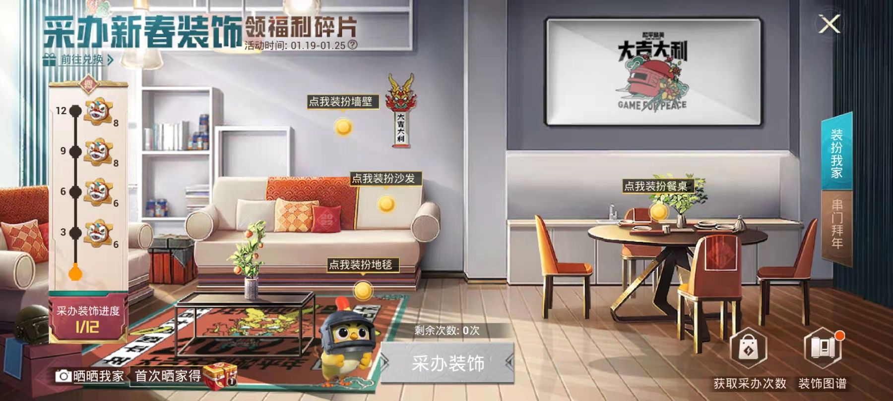 每逢春节,置办家具肯定会是少不了的。新春彩办装饰内获取装扮次数,分别来装扮和平小家的墙壁、沙发、地毯和餐桌。新春彩办装饰中获取彩办次数的方法相对接龙领降落伞简单,但只要玩家每日玩上几局游戏就可以了。比如玩家每日登录游戏,达到游戏任意模式的生存时长,都可以获得1次彩办次数。另外作为装饰的玩法,玩家可以选择的妆时就非常多,比如墙壁就有平安节、新春挂画、大吉窗花、醒狮挂饰。而且像醒狮挂饰、真皮沙发、大理石餐桌、乌龙地毯这些高级装饰都有对应的服饰,玩家在解锁这些高级装饰的同时,还可领取对应的服饰币奖励,可以说书收货颇丰。