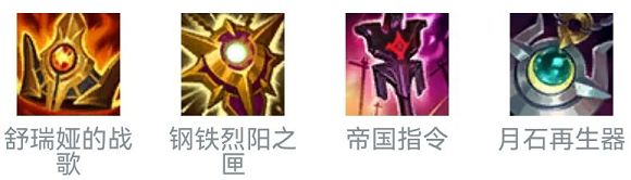 辅助的装备有着舒瑞娅的战歌,钢铁烈阳之匣,帝国指令和月石再生器这四个,这些其中舒瑞娅的战歌和钢铁烈阳之匣能够提供团队机动性和保护能力,帝国指令和月石再生器能够提供伤害能力和回复能力。狂风之力,海妖杀手和不朽盾弓这三个adc装备可以提供机动性,伤害能力和保命能力。