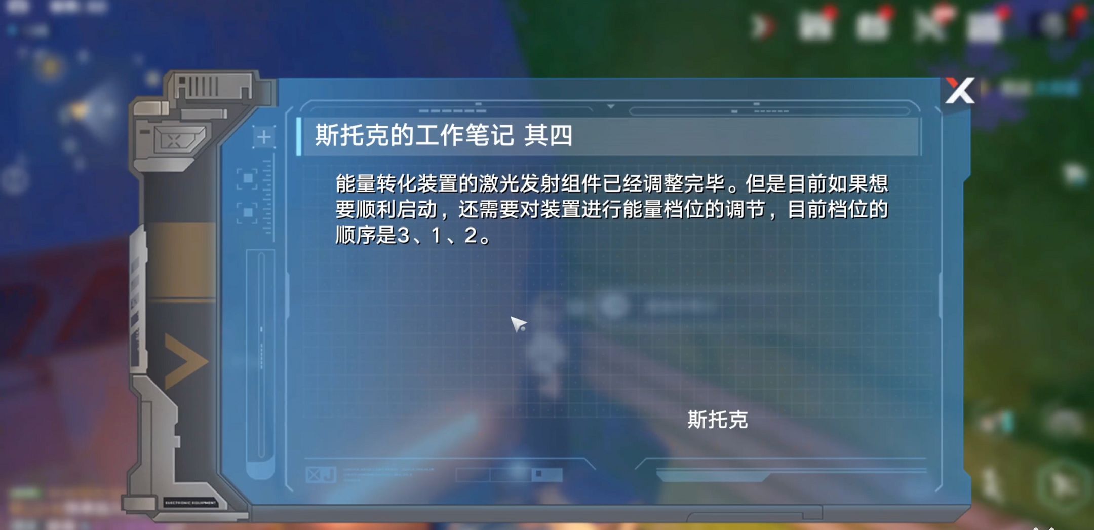 6、根据提示启动能量转化装置,具体档位为3、1、2。启动后就完成任务啦。