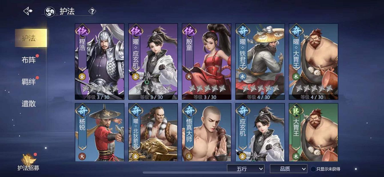 护法在游戏内可是很重要的存在,它能帮助玩家快速提升战力,目前游戏内已有的护法一共是49位,分别包含了臻、绝、奇、良、凡,五个护法种类,其中臻品为最高品质护法,护法的最大上阵数量会随着玩家等级提高而不断增加的,起开始是1个,最多的为4个。